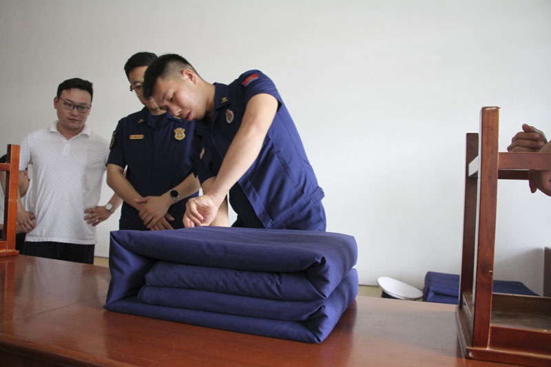 培訓結束后,喬副站長又帶著我們參觀了整個救援站,讓我們親自試穿了一下防火戰(zhàn)斗服,并結合接警出動到滅火救援的全過程進行了細致的講解,參觀內(nèi)務時,還給我們展示了一個“豆腐塊”軍被是如何疊出來的。一整個下午的時間,讓全體人員對消防基本知識和滅火技能有了更加全面的認識。