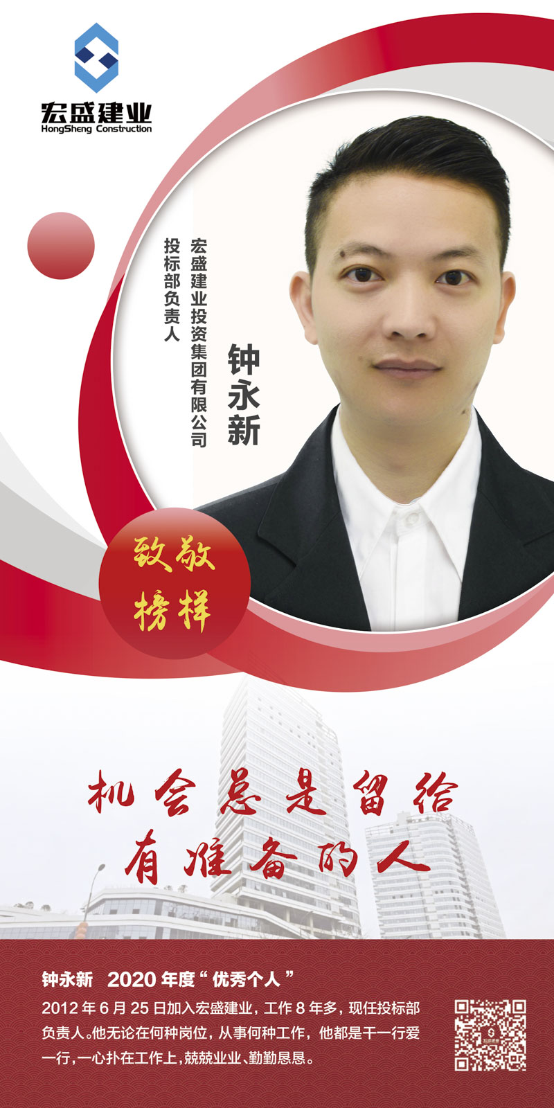 人物小傳:鐘永新,生于1987年,廣東省南雄市人,2012年6月25日加入宏盛建業(yè),工作8年多,現(xiàn)任投標(biāo)部負(fù)責(zé)人。