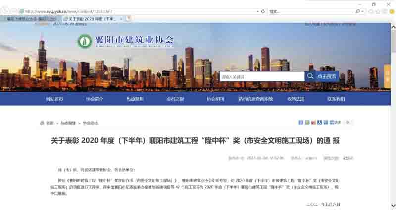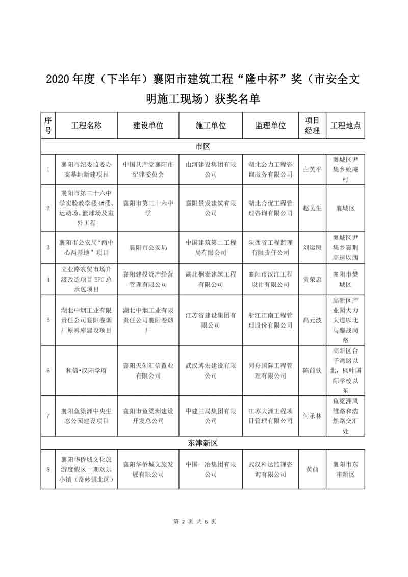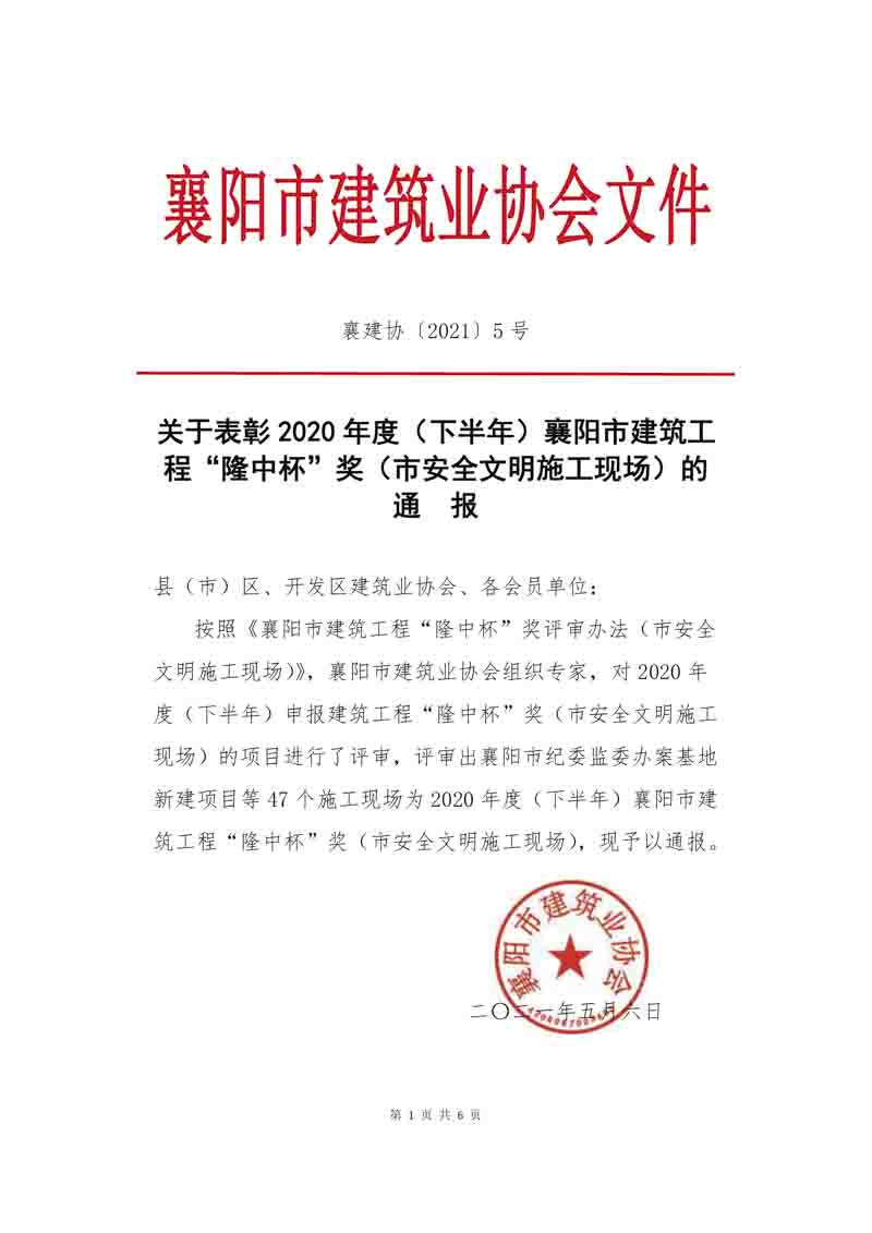 近日,在襄陽市2020 年度(下半年)建筑工程“隆中杯”獎(jiǎng)(市安全文明施工現(xiàn)場(chǎng))評(píng)審出的 47 個(gè)施工現(xiàn)場(chǎng)中,宏盛建業(yè)投資集團(tuán)承建的棗陽市汽車客運(yùn)中心站(一期)項(xiàng)目榮獲此獎(jiǎng)項(xiàng)。