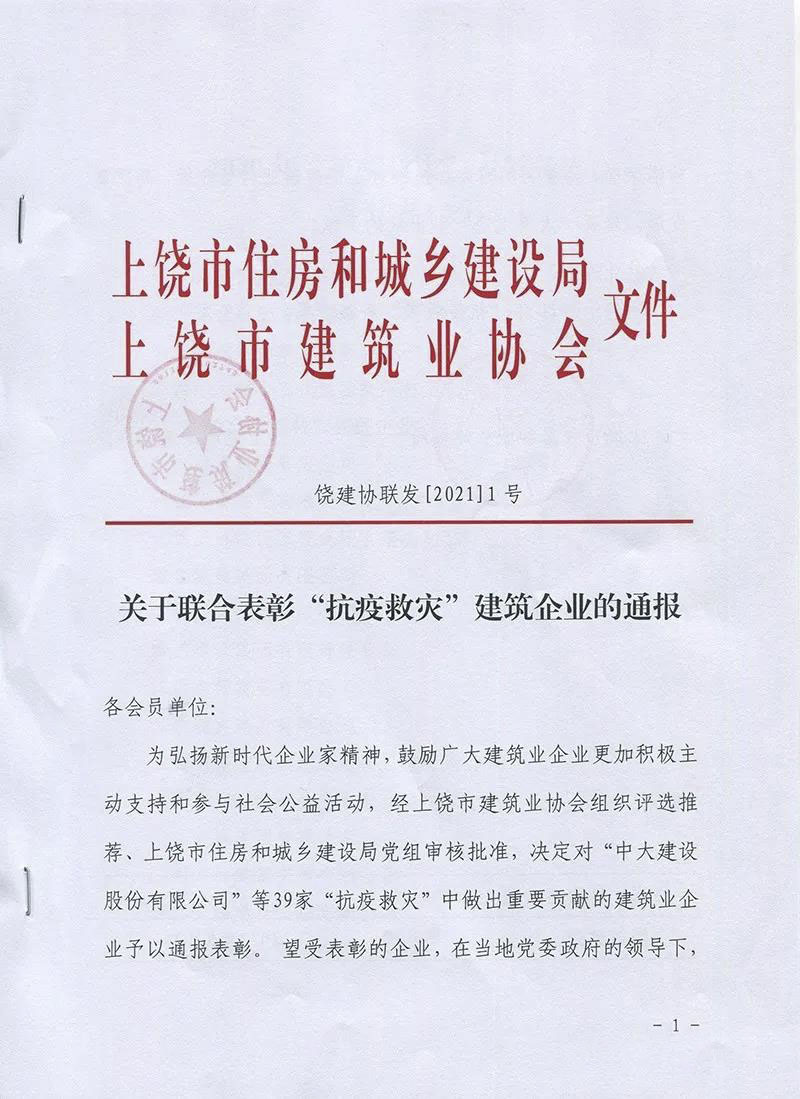 近日,經(jīng)上饒市建筑業(yè)協(xié)會組織評選推薦、上饒市住房和城鄉(xiāng)建設(shè)局黨組審核批準(zhǔn),對“抗疫救災(zāi)“中作出重要貢獻(xiàn)的建筑企業(yè)予以通報表彰。集團(tuán)獲評“2020年抗疫救災(zāi)突出貢獻(xiàn)企業(yè)“!